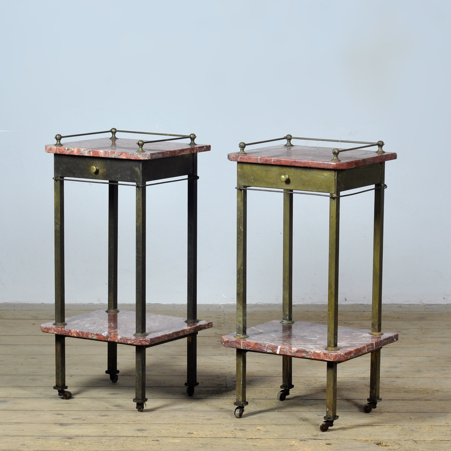Set nachtkastjes uit circa 1900 vormt een aanvulling op ieder klassiek of eclectisch interieur. De kastjes zijn vervaardigd uit messing, dat door de jaren heen een prachtig patina heeft ontwikkeld. De bladen zijn uitgevoerd in marmer, met een warme roodtint en natuurlijke adering. De slanke, rechtlijnige vormgeving wordt geaccentueerd door subtiele details, zoals de opstaande rand en de knoppen. Dankzij de wieltjes zijn de kastjes eenvoudig te verplaatsen. Deze combinatie van functionaliteit en esthetiek weerspiegelt het vakmanschap van rond de eeuwwisseling. Een zeldzame en karaktervolle set.