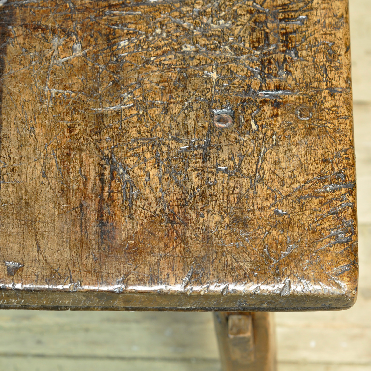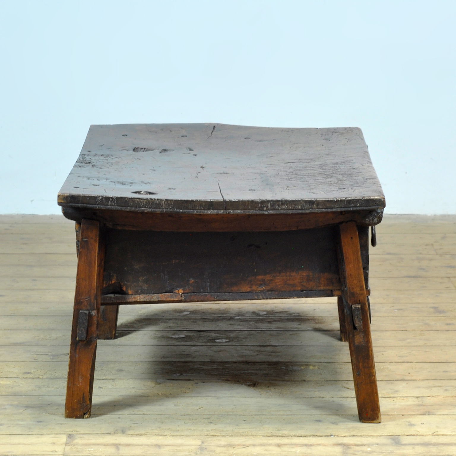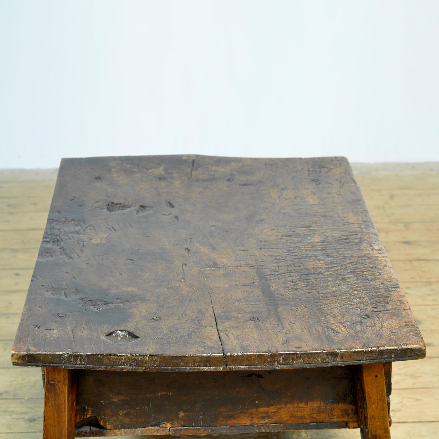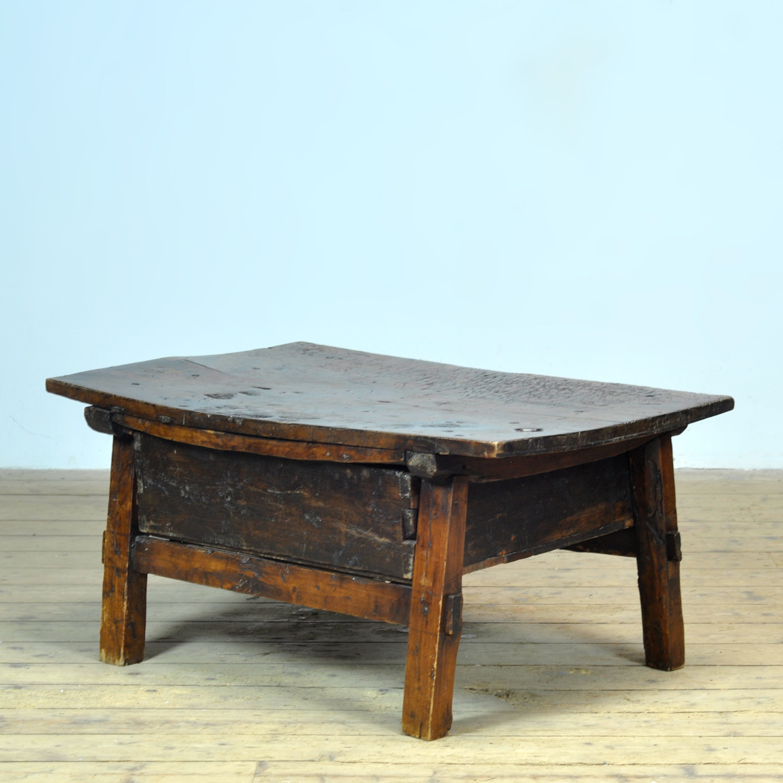 Dit Spaanse tafeltje, vervaardigd uit massief kastanjehout, dateert uit eind 17e of begin van de 18e eeuw vormt een bijzonder fraai voorbeeld van historisch vakmanschap. Het blad, wat bestaat uit één stuk hout toont een uitzonderlijk rijke patina, ontstaan door eeuwenlang gebruik, wat het meubel een warme en karaktervolle uitstraling geeft. De tafel is voorzien van een lade met traditionele zwaluwstaartverbindingen, een teken van hoogwaardige ambachtelijke constructie. De robuuste vormgeving en ingetogen details maken dit stuk zowel functioneel als decoratief. Een uniek object dat perfect tot zijn recht komt in een klassiek of eclectisch interieur en een tastbare verbinding vormt met het verleden.