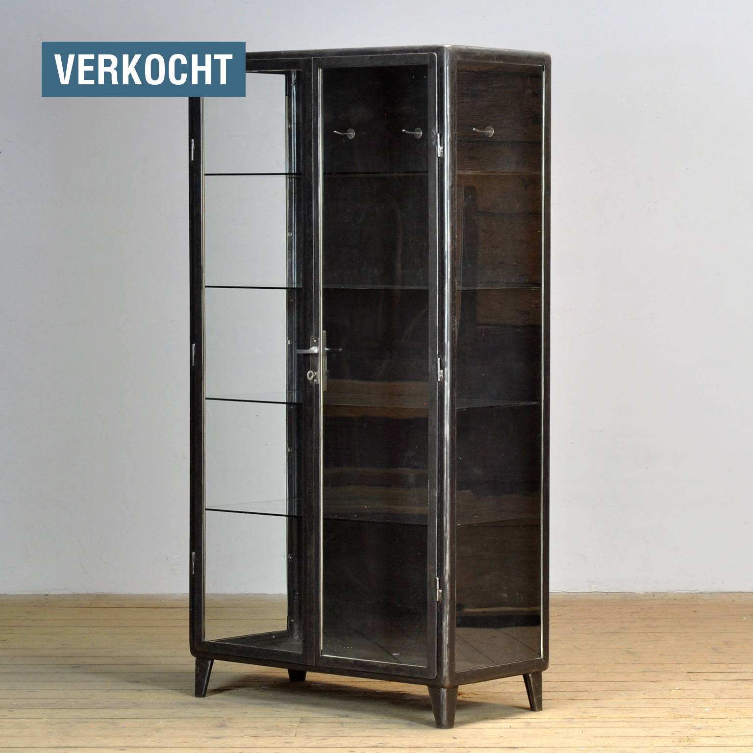 Poolse medicijnkast, geproduceerd in de jaren ’60. Gemaakt van ijzer en glas. Elegant ontwerp met afgeronde hoeken. Aan de binnenkant drie kledinghaken en 4 nieuwe glasplanken. De kast is gestript tot het metaal en afgewerkt met een transparante lak.