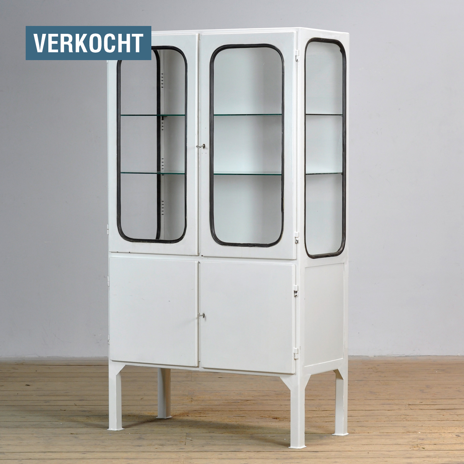 Vintage medicijnkast gemaakt van ijzer en glas dat door een rubber strip in het staal wordt geklemd. De kast komt uit de jaren ’70 en is geproduceerd in Hongarije. Goed werkende sloten met sleutels. De kast wordt geleverd met 2 glazen planken.