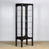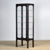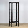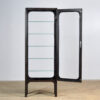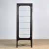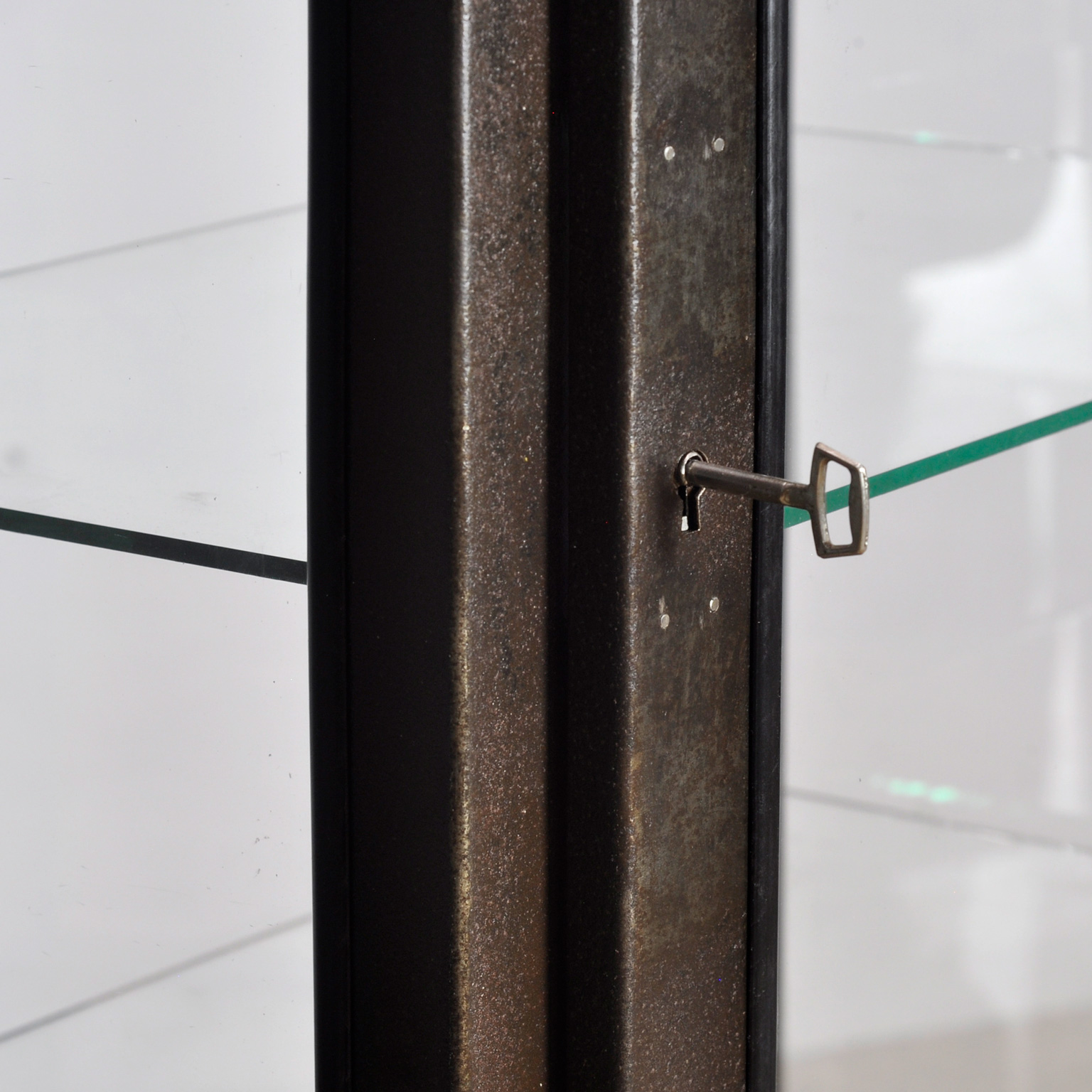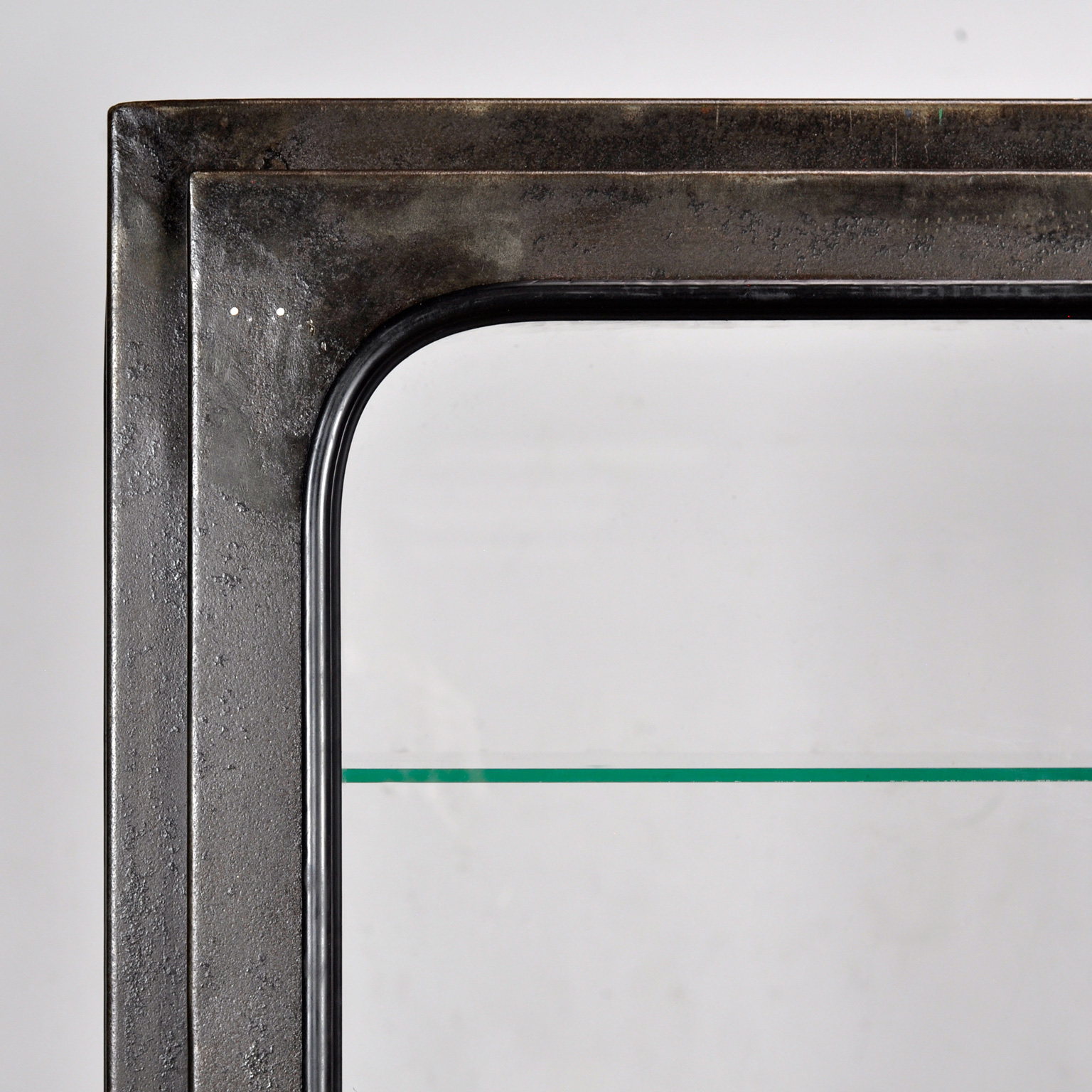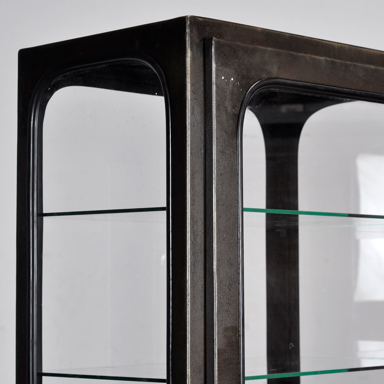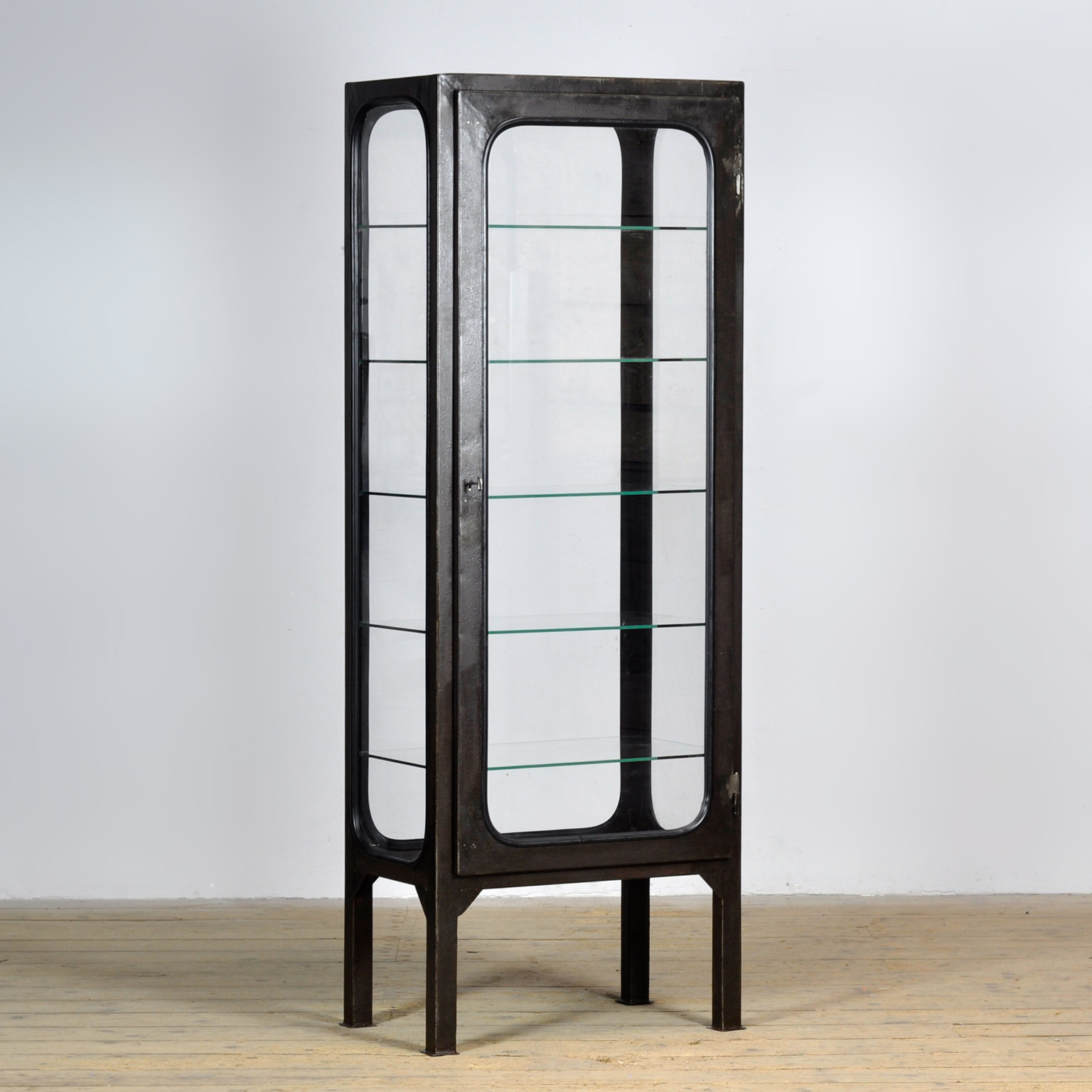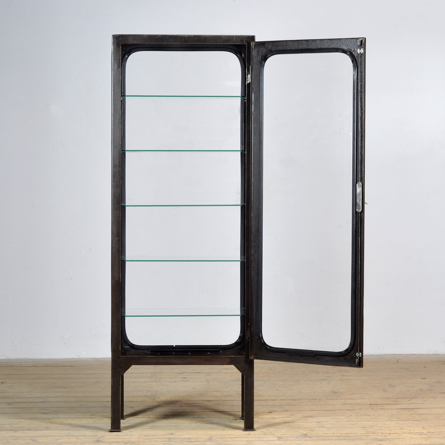 Vintage medicijnkast uit de jaren ’70, geproduceerd in Hongarije. Deze kast is een echte eyecatcher dankzij het industriële ontwerp en de volledig glazen wanden aan alle vier zijden. De kast is gemaakt van ijzer en glas, waarbij het glas stevig in het frame is geklemd met rubber strips. De kast is volledig gestript tot het metaal en daarna afgewerkt met een transparante lak, waardoor de originele industriële uitstraling behouden blijft. De kast wordt geleverd met vijf verstelbare glazen planken, ideaal voor het stijlvol presenteren van objecten, servies of verzamelstukken. Dankzij het glas rondom komt er veel licht binnen, wat zorgt voor een prachtige presentatie van de inhoud.