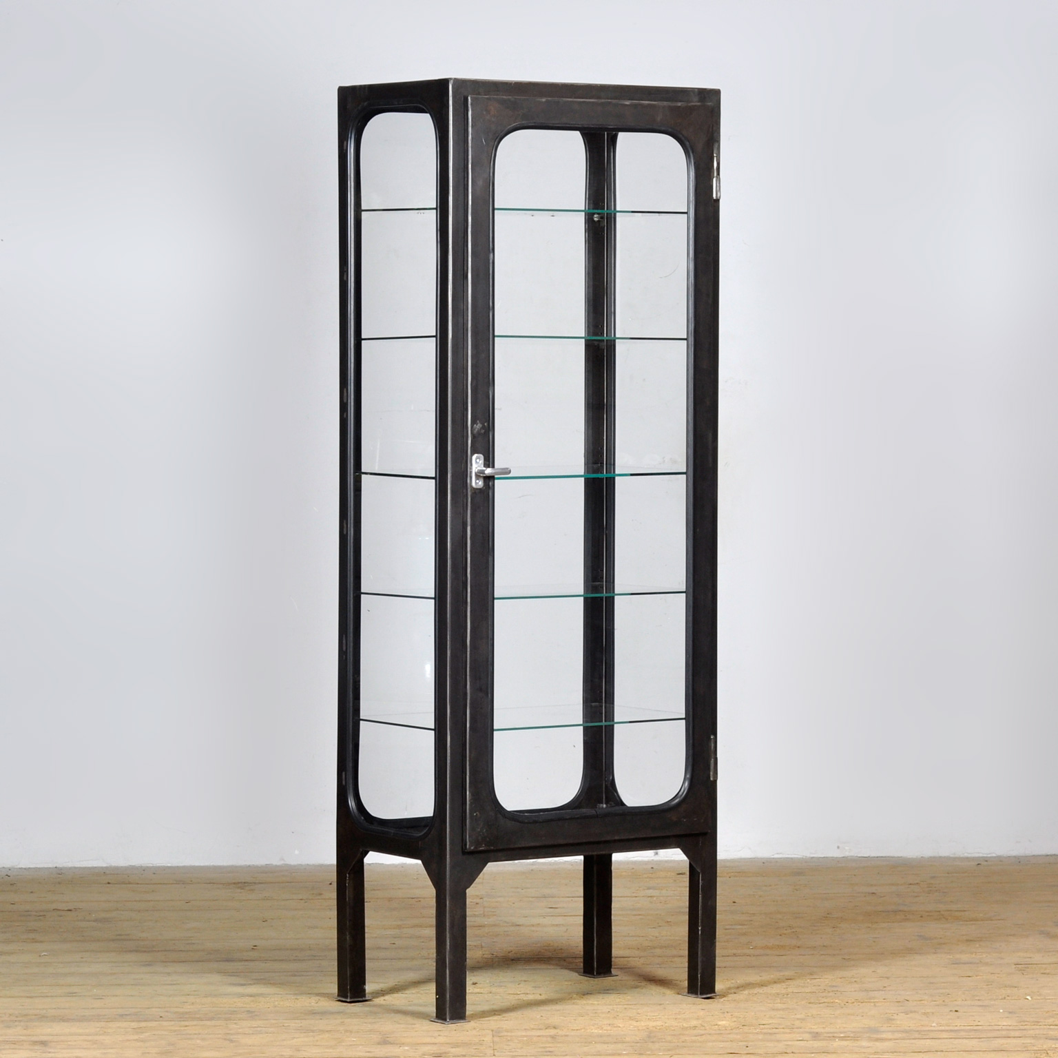 Vintage medicijnkast uit de jaren ’70, geproduceerd in Hongarije. Deze kast is een echte eyecatcher dankzij het industriële ontwerp en de volledig glazen wanden aan alle vier zijden. De kast is gemaakt van ijzer en glas, waarbij het glas stevig in het frame is geklemd met rubber strips. De kast is volledig gestript tot het metaal en daarna afgewerkt met een transparante lak, waardoor de originele industriële uitstraling behouden blijft. De kast wordt geleverd met vijf verstelbare glazen planken, ideaal voor het stijlvol presenteren van objecten, servies of verzamelstukken. Dankzij het glas rondom komt er veel licht binnen, wat zorgt voor een prachtige presentatie van de inhoud.
