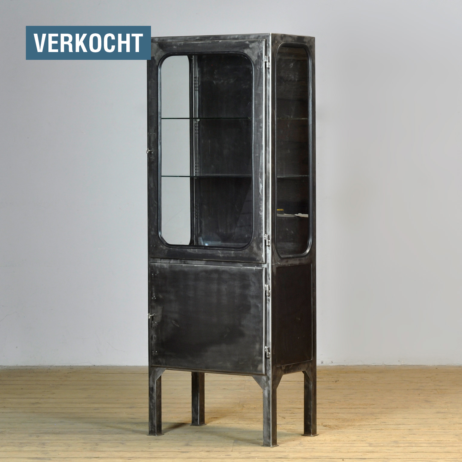 Vintage medicijnkast uit de jaren ’70, geproduceerd in Hongarije. De kast is gemaakt van ijzer en glas, waarbij het glas stevig in het frame is geklemd met rubber strips. De kast is volledig gestript tot het metaal en daarna afgewerkt met roestwerende olie, waardoor de originele industriële uitstraling behouden blijft. De kast wordt geleverd met twee verstelbare glazen planken, ideaal voor het stijlvol presenteren van objecten, servies of verzamelstukken.