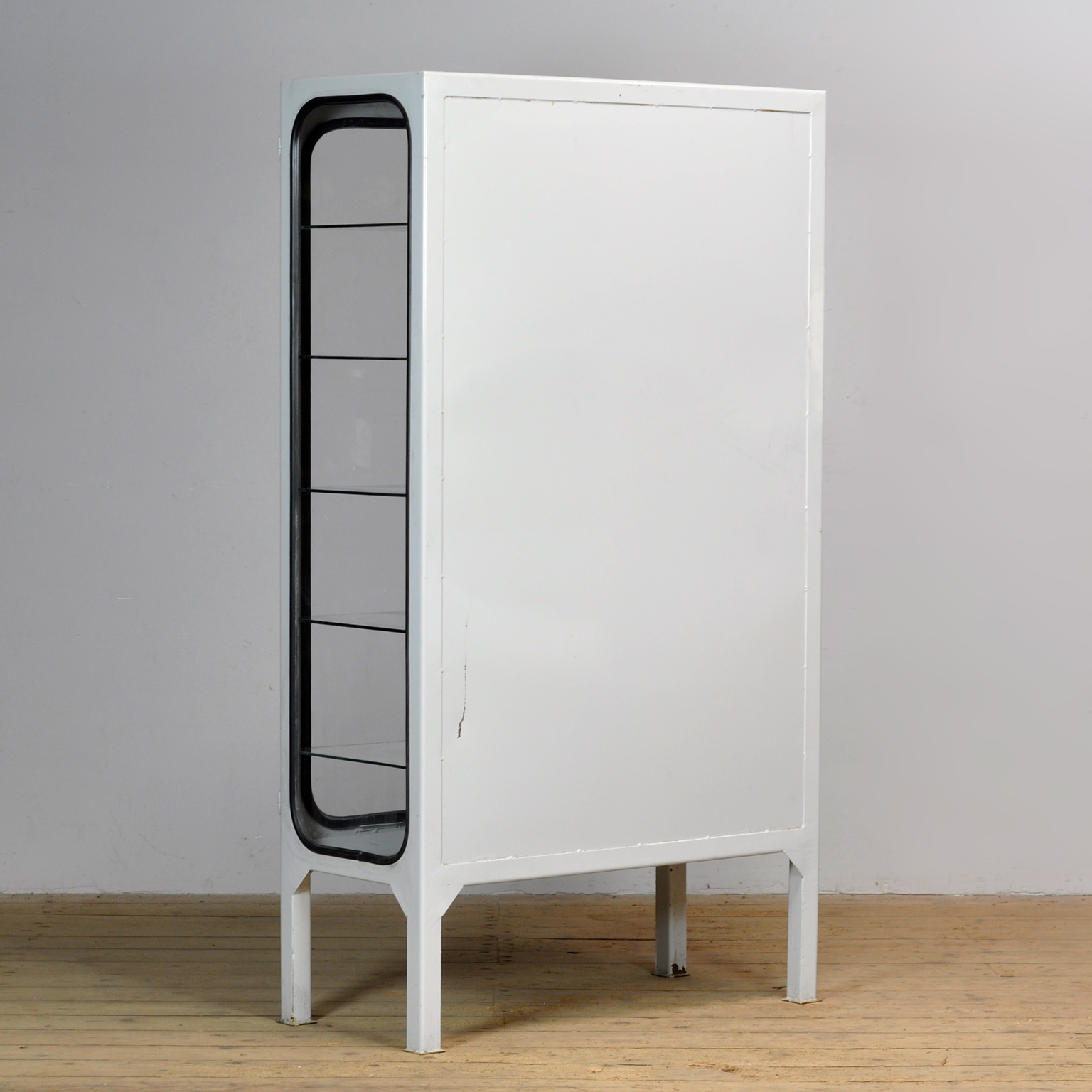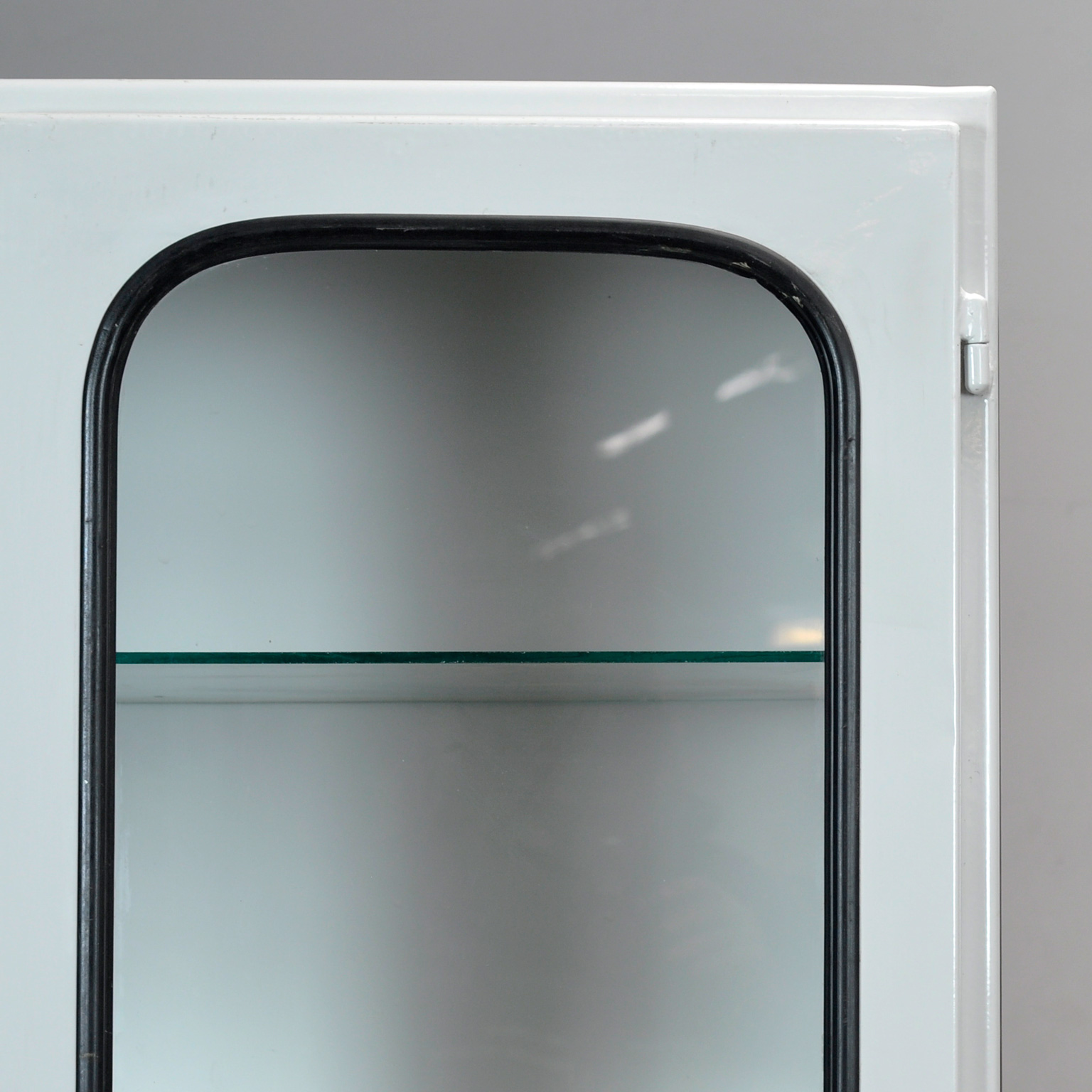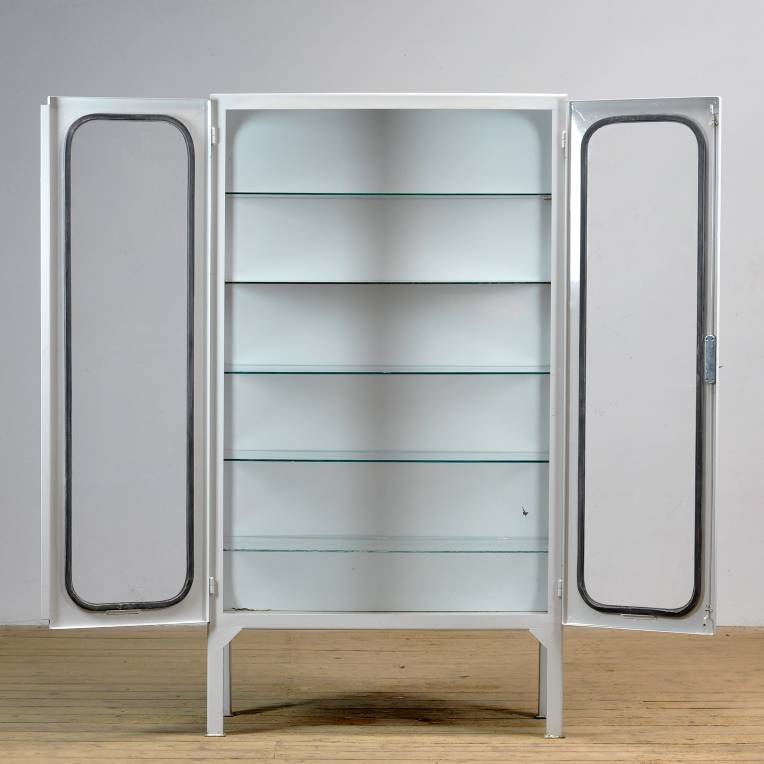 Vintage medicijnkast uit de jaren ’70, geproduceerd in Hongarije. Deze karaktervolle kast is gemaakt van ijzer en glas, waarbij het glas met een rubber strip in het staal is geklemd. De kast heeft een strak, tijdloos ontwerp en past perfect in een industrieel, modern of mid-century interieur. Voorzien van een goed werkend slot inclusief sleutel, ideaal voor het opbergen van servies, verzamelobjecten of designstukken. De kast wordt geleverd met vijf verstelbare glazen planken, zodat je de indeling eenvoudig kunt aanpassen. Een unieke en functionele eyecatcher met authentieke vintage uitstraling.