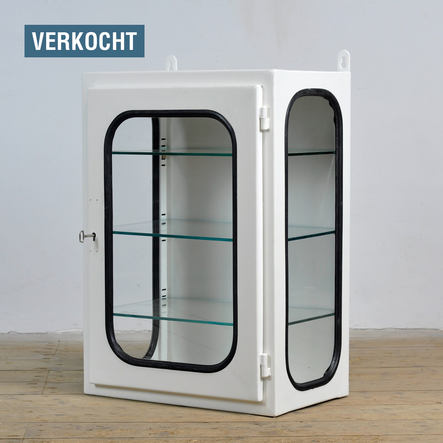 Medicijnkastje (wall unit) uit een ziekenhuis. Gemaakt van ijzer en glas dat door een rubber strip in het staal wordt geklemd. Dit kastje komt uit de jaren ’70 en is geproduceerd in Hongarije. Met 3 verstelbare glazen planken.