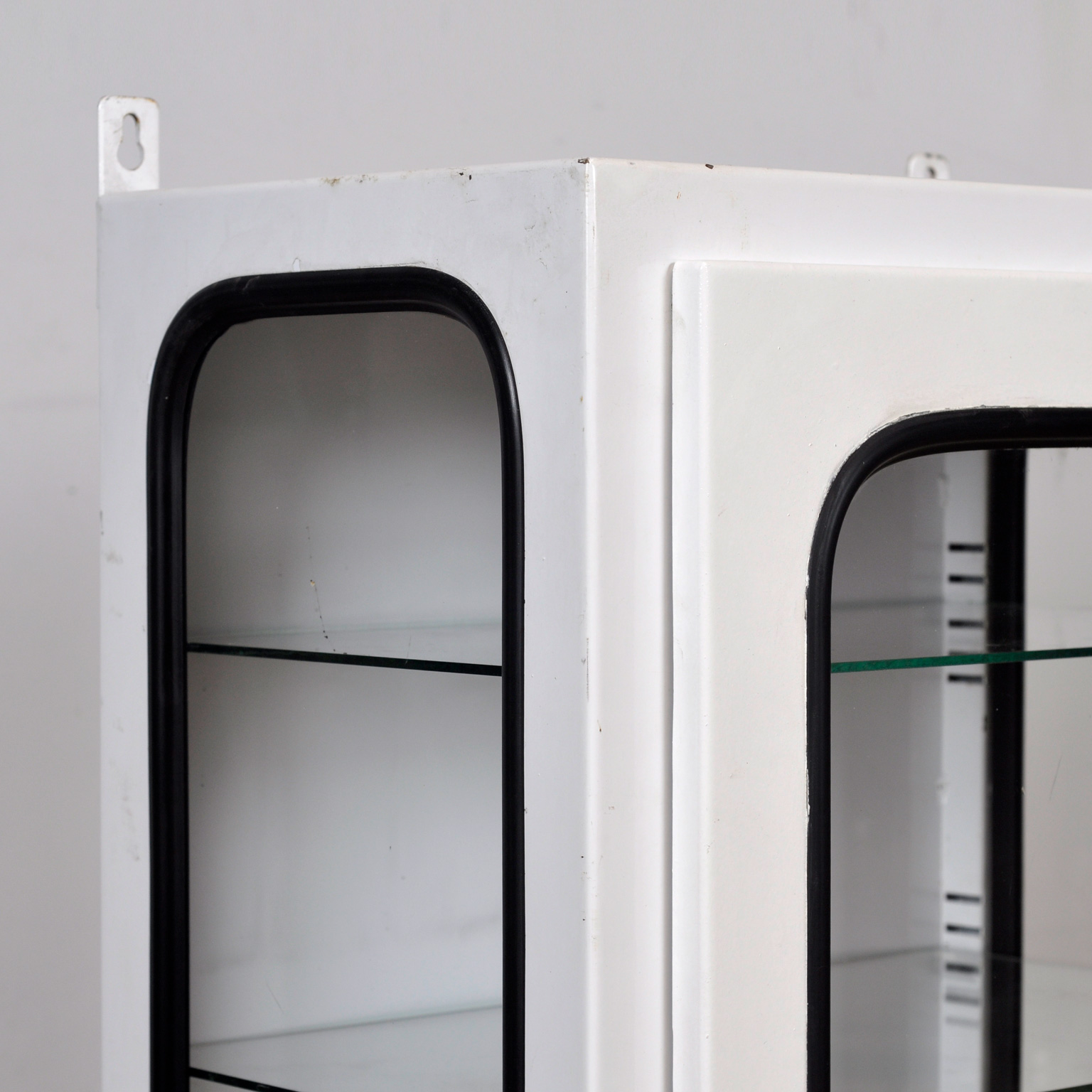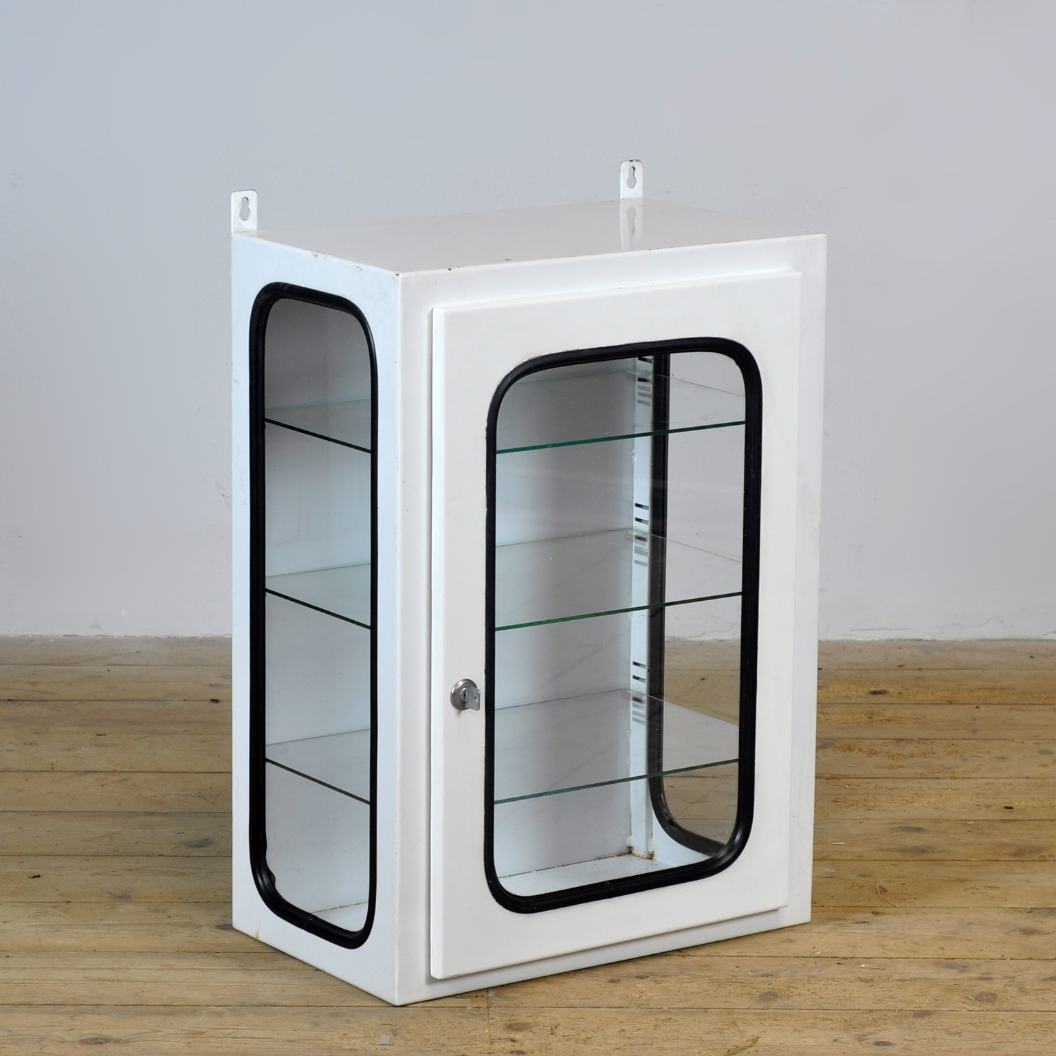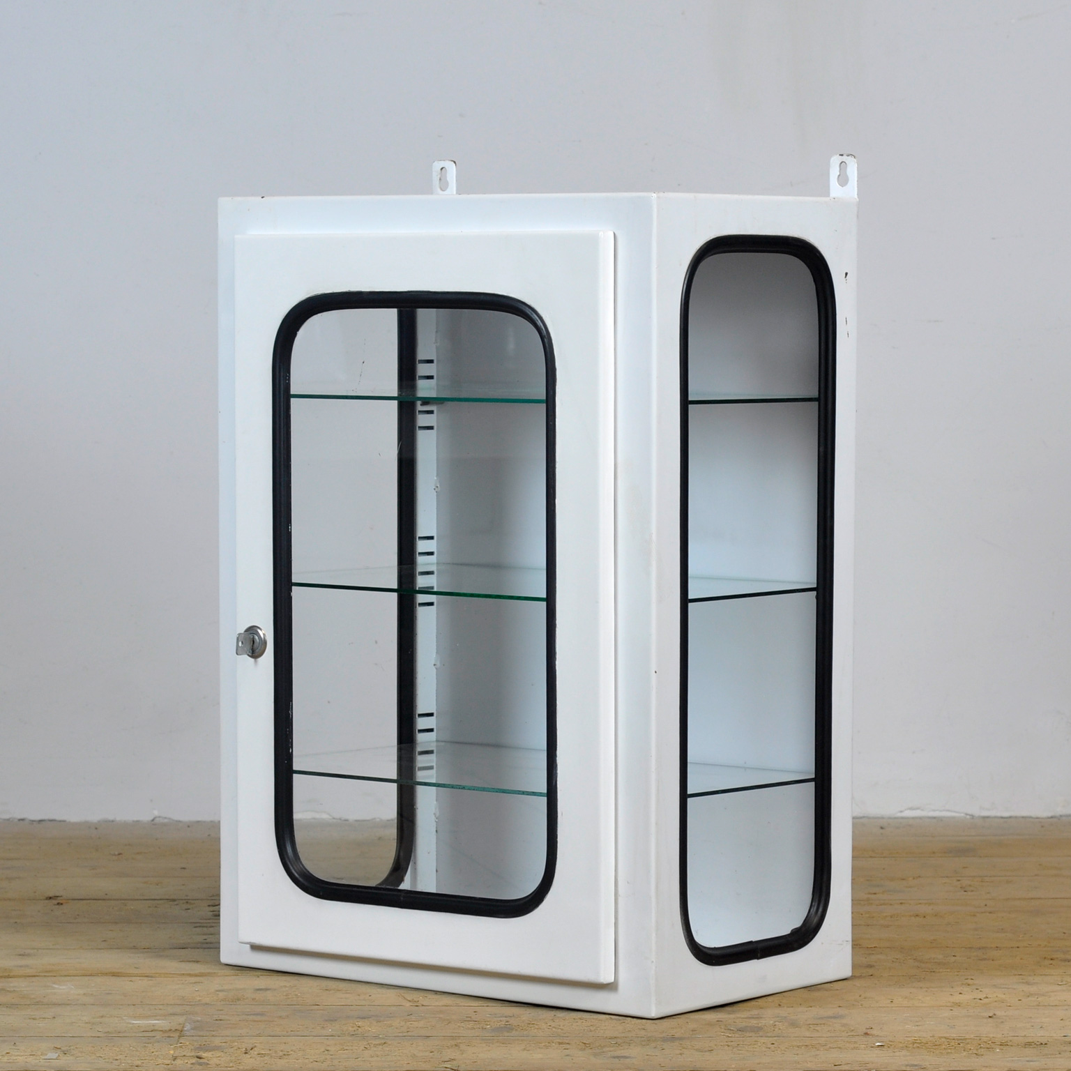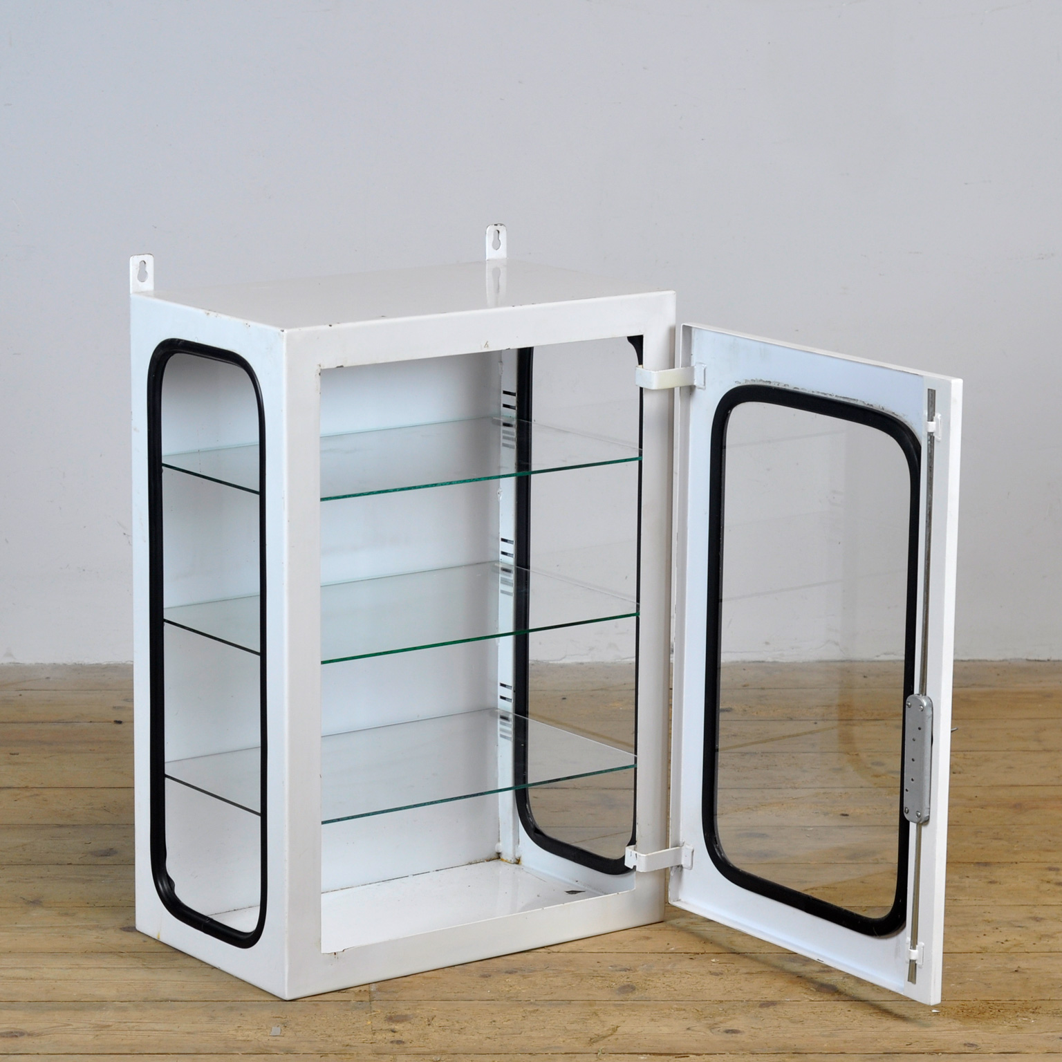Medicijnkastje (wall unit) uit een ziekenhuis. Gemaakt van ijzer en glas dat door een rubber strip in het staal wordt geklemd. Dit kastje komt uit de jaren ’70 en is geproduceerd in Hongarije. Met 3 verstelbare glazen planken.