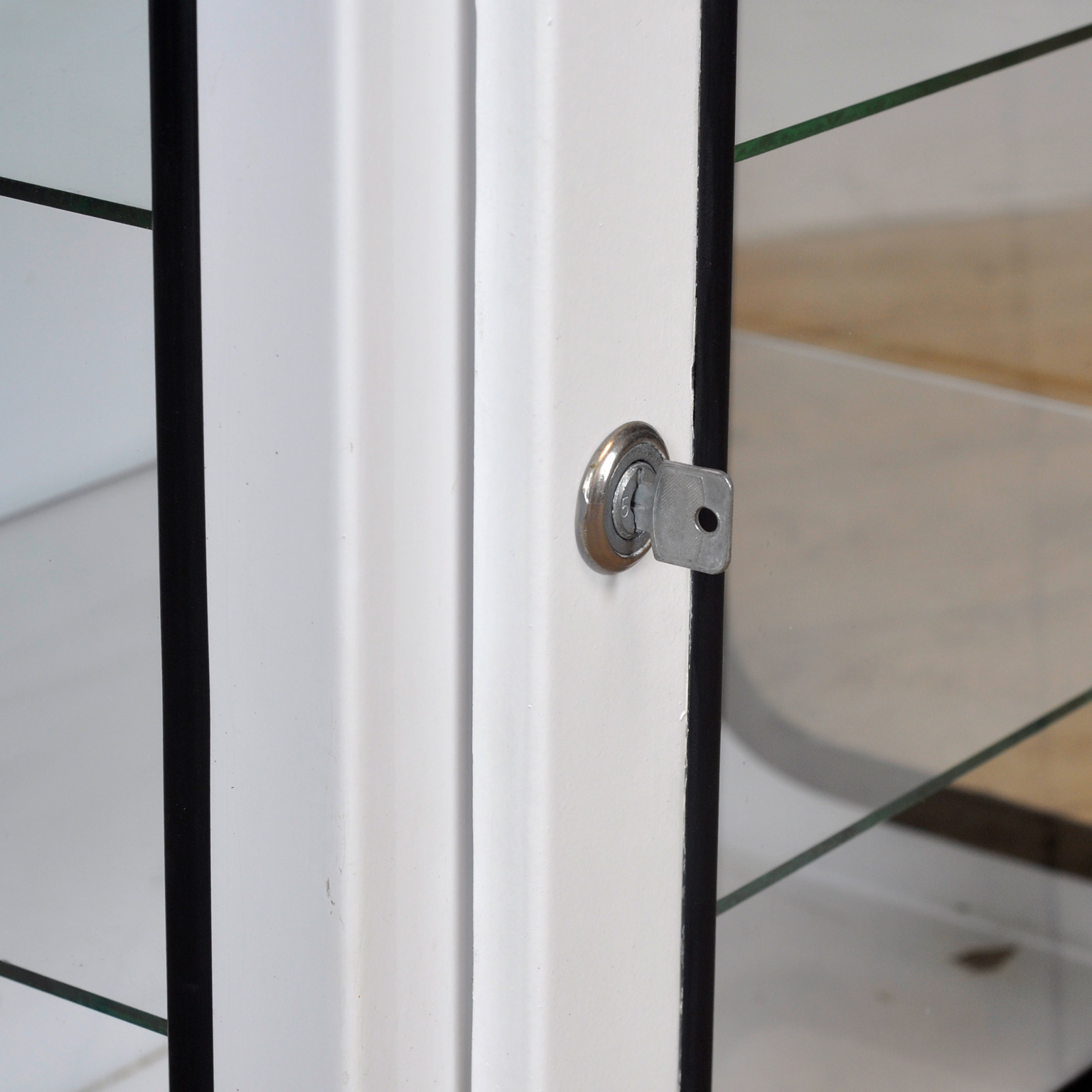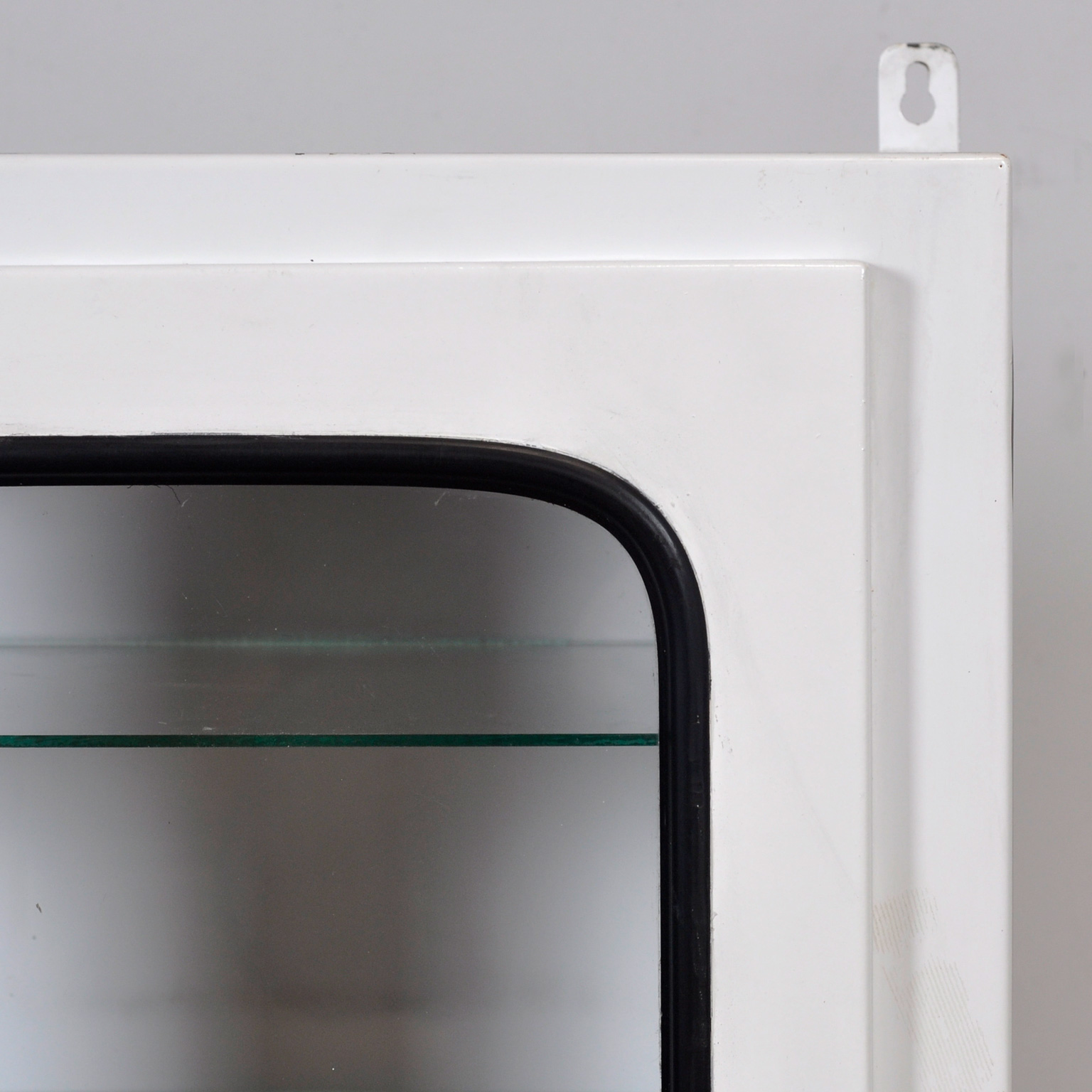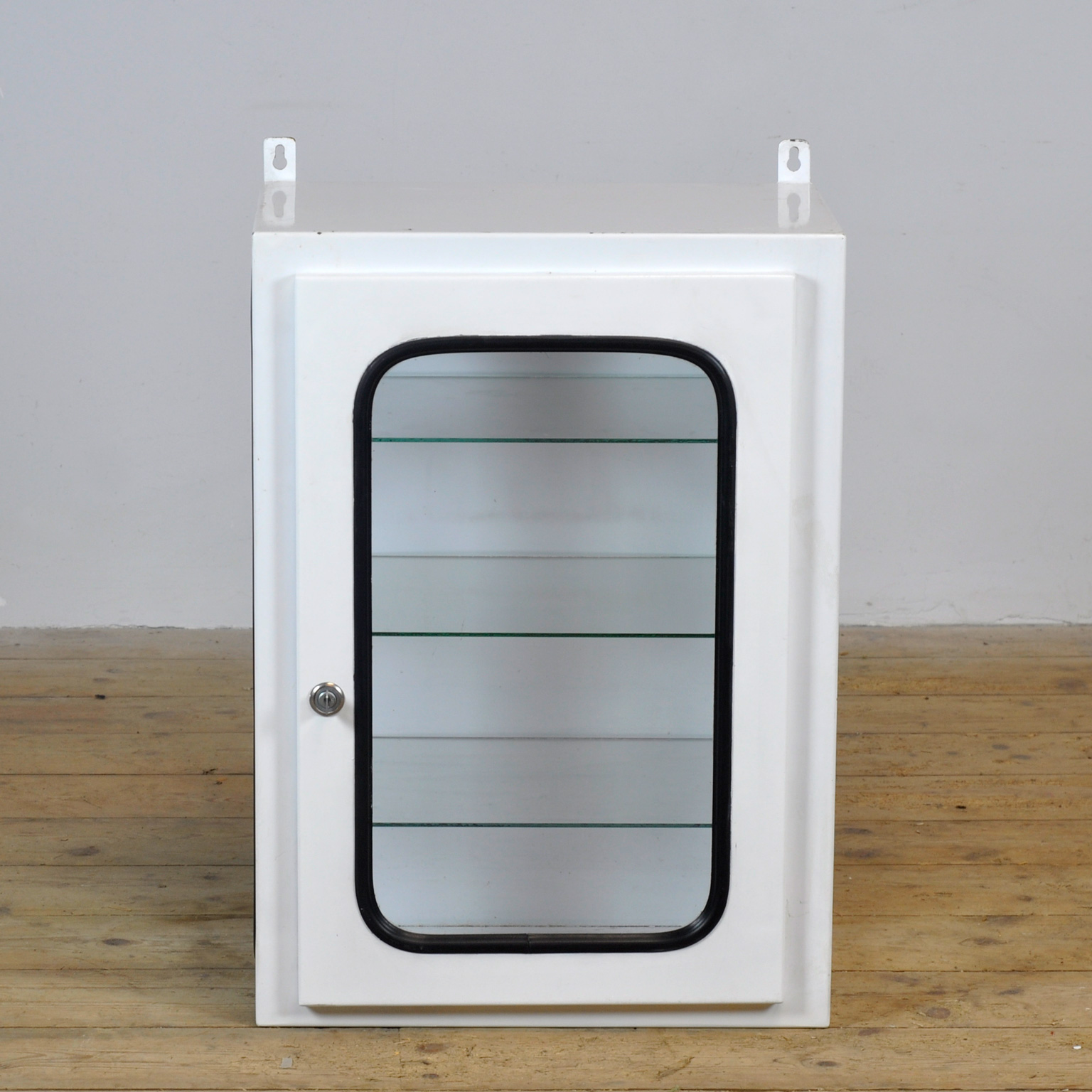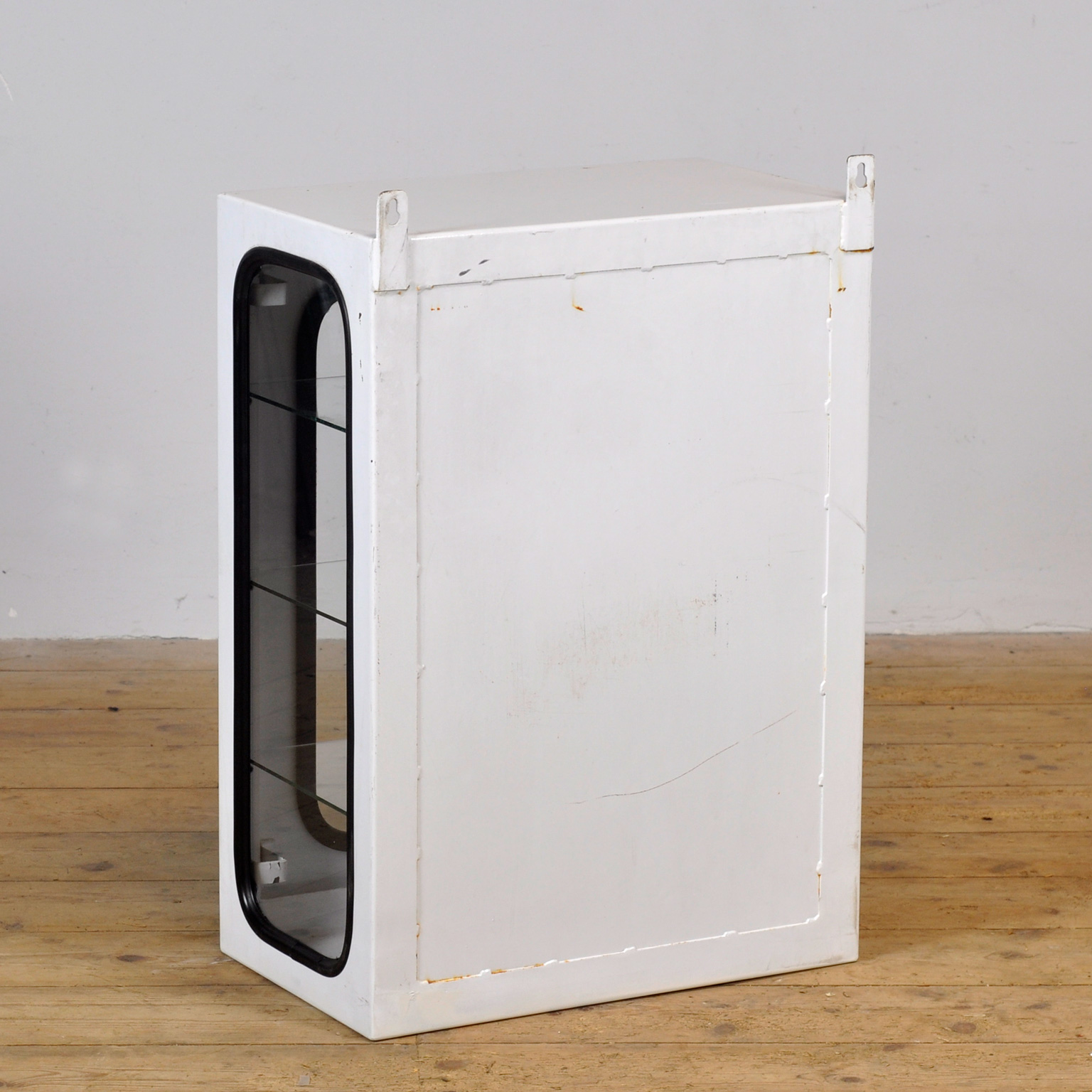 Medicijnkastje (wall unit) uit een ziekenhuis. Gemaakt van ijzer en glas dat door een rubber strip in het staal wordt geklemd. Dit kastje komt uit de jaren ’70 en is geproduceerd in Hongarije. Met 3 verstelbare glazen planken.