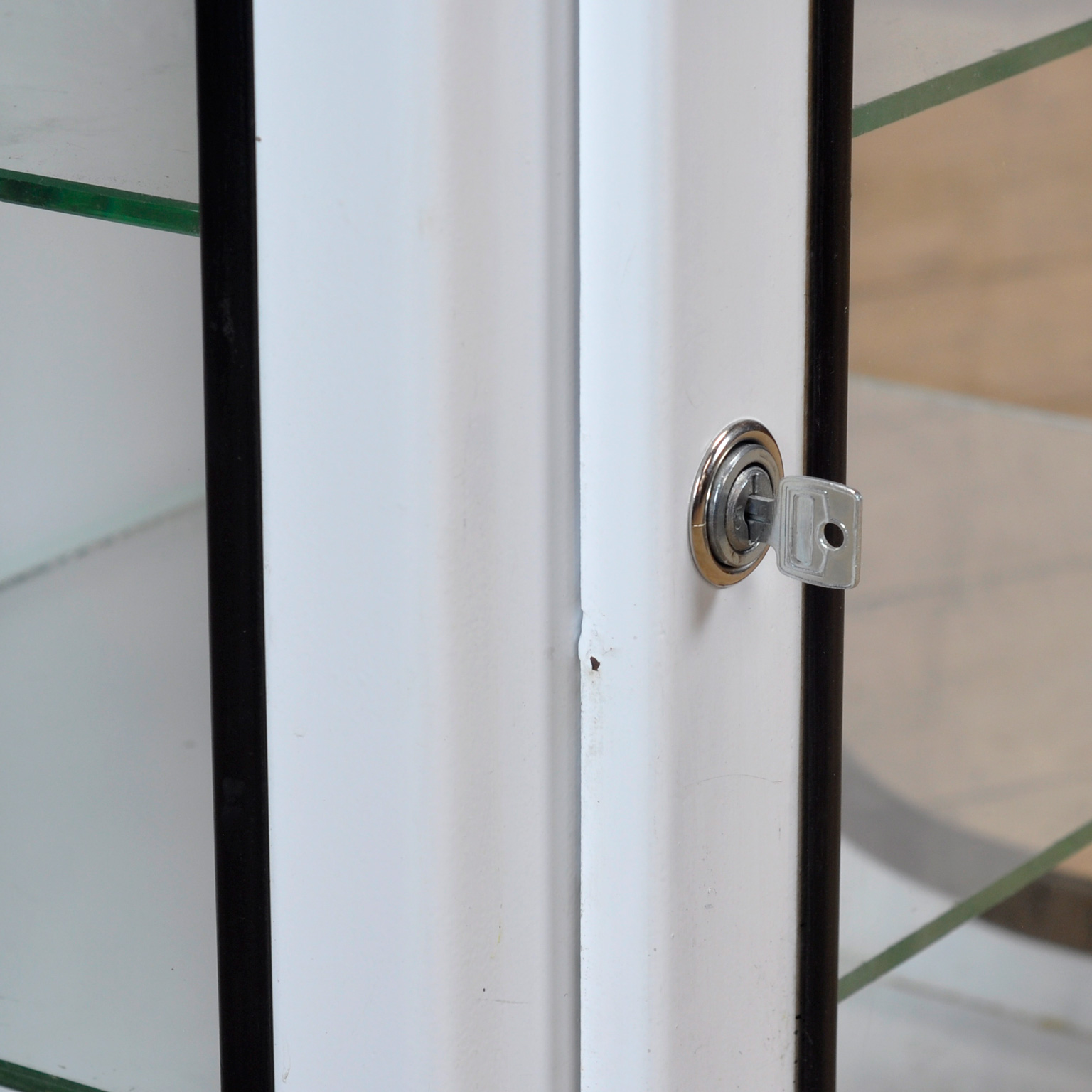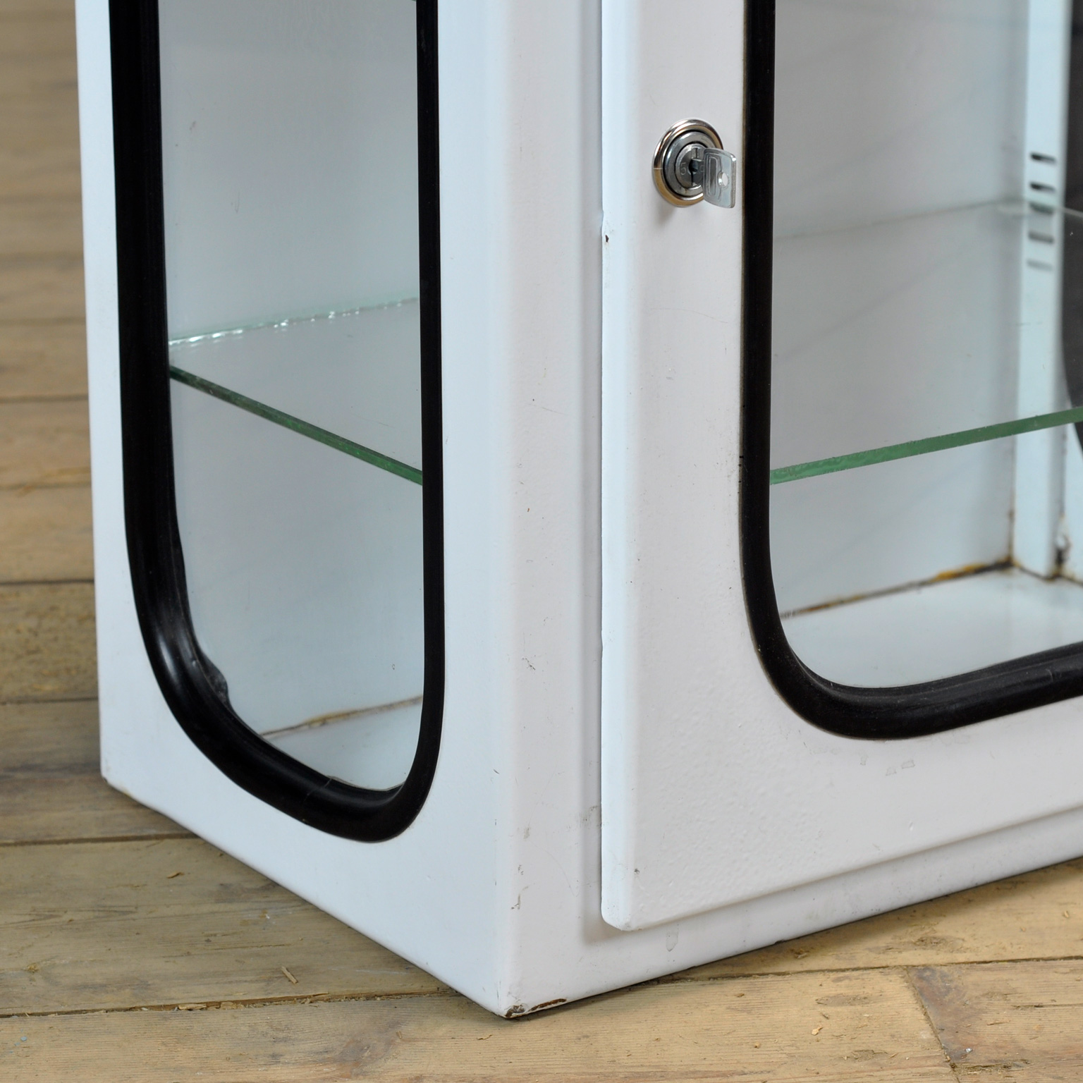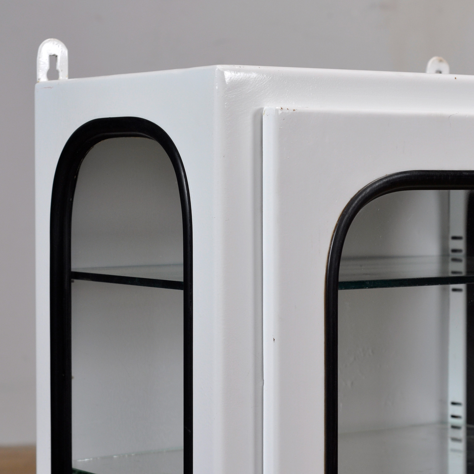 Medicijnkastje (wall unit) uit een ziekenhuis. Gemaakt van ijzer en glas dat door een rubber strip in het staal wordt geklemd. Dit kastje komt uit de jaren ’70 en is geproduceerd in Hongarije. Met 3 verstelbare glazen planken.