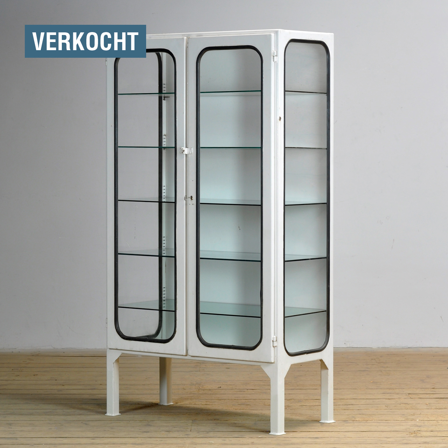 Medicijnkast van ijzer en glas dat door een rubber strip in het ijzer wordt geklemd. De kast komt uit de jaren ’70 en is geproduceerd in Hongarije. Goed werkend slot met sleutel. De kast wordt geleverd met 5 glazen (verstelbare) planken.